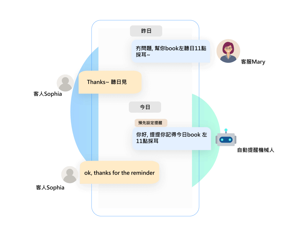 例如:Ear’s客户成功预约采耳服务后,偶尔忘记或记错预约时间,错过服务。或者有部分客户不在预约时间到Ears门店,发现不是自己预约的时间。抑或Ears在准备好之后,客人未及时到达,而dumbChat的自动提醒讯息功能在deadline时间前提醒客户及时到店。