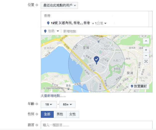 Facebook还可以根据用户的年龄、性别、语言、兴趣等等进行设置,这方面的设置需要更加实际情况去调整。如果是在香港,可以不用设置语言,有些香港人会使用英文界面。不过有一点比较不方便的是,年龄和语言不可以使用排除方法,即你不能排除使用某种语言的人。